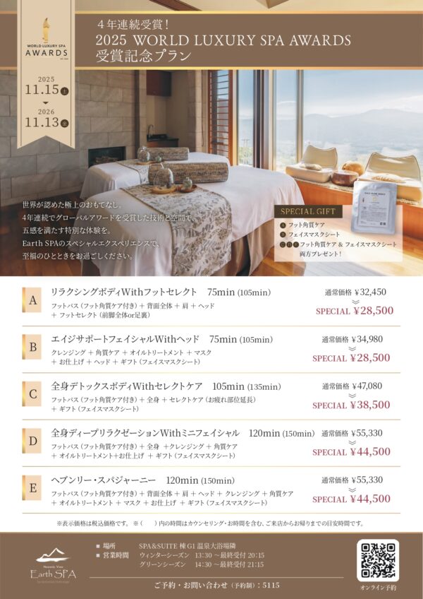 日頃よりご愛顧いただいている皆さまへの感謝の気持ちを込めて、各スパでは期間限定の受賞記念プランをご用意しております。