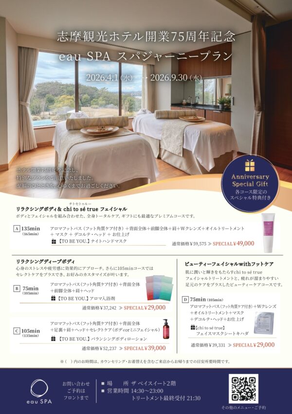 志摩観光ホテル開業75周年を記念し、eau SPAより期間限定のスペシャルプランが2026年4月1日より登場!
